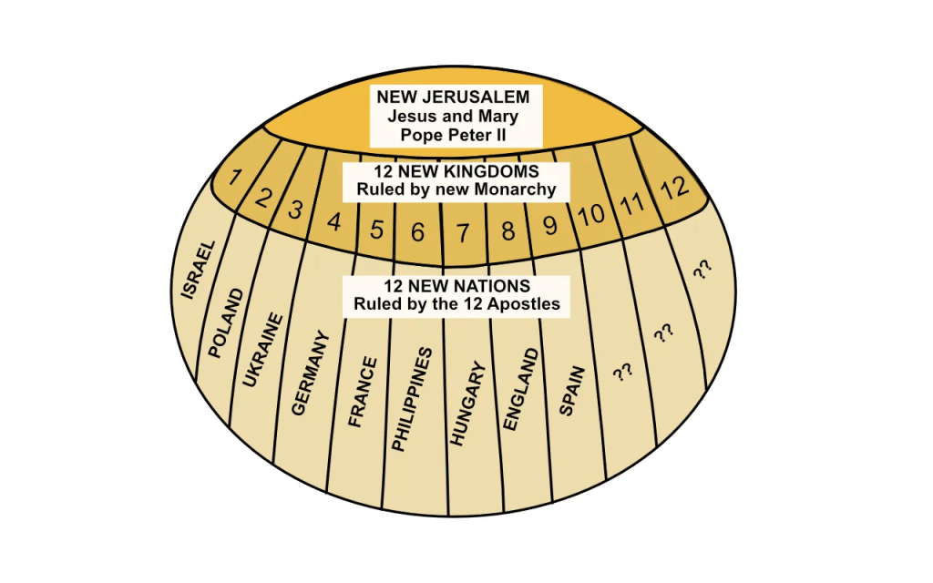 O mundo será dividido em Doze Nações governadas por Doze Apóstolos, que são Reis, não casados, e Cardeais sob o Papa Pedro II, o último papa. As Doze nações incorporarão todas as nações contemporâneas.